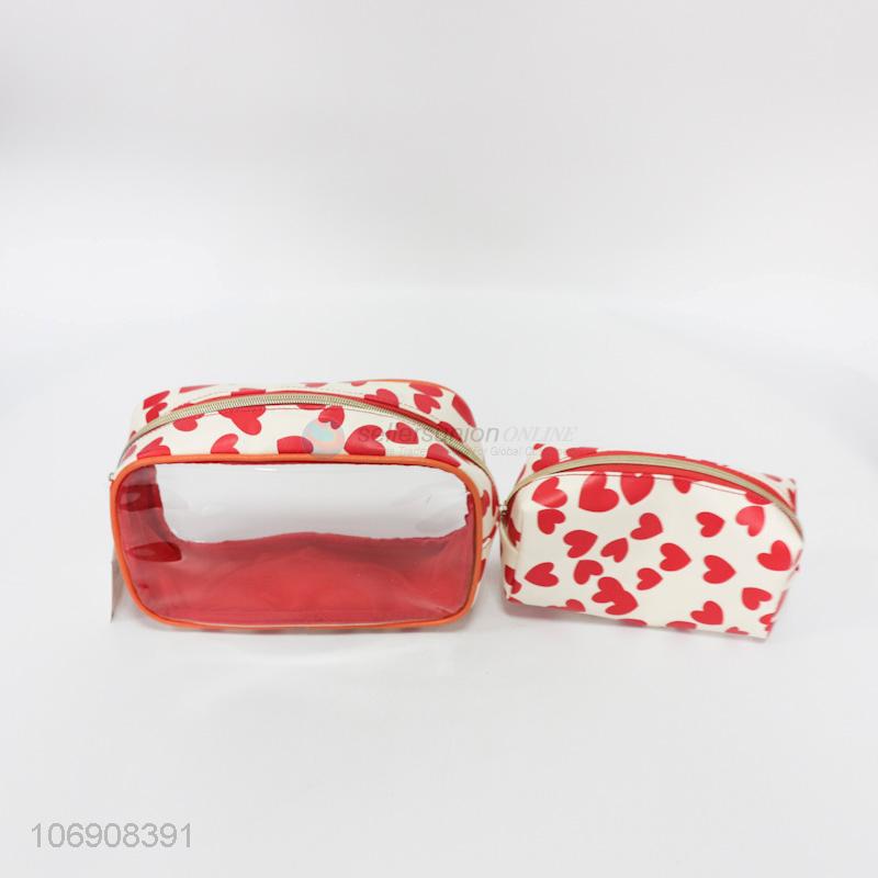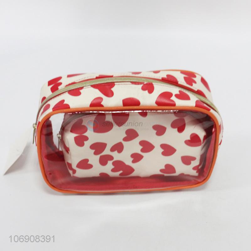 Best quality fashion heart printed pvc cosmetic bag set