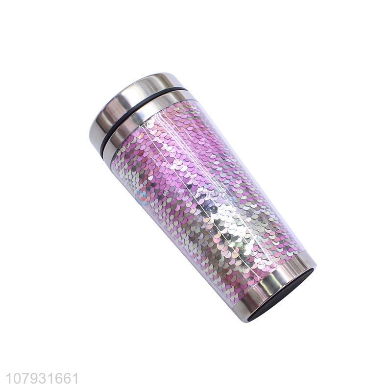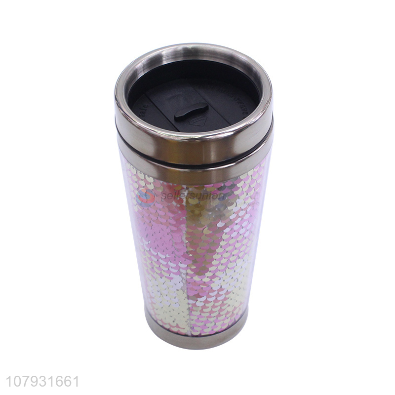China factory double walled sequined reusable plastic coffee tumbler with lid