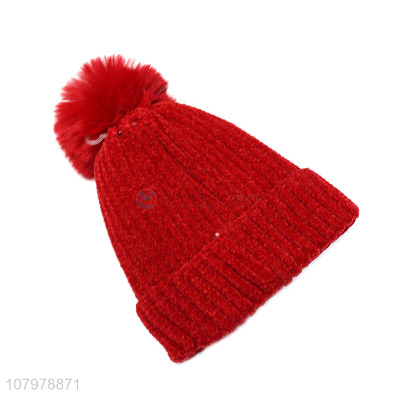 Wholesale cartoon women winter fleece lined beanie with faux fur pom pom