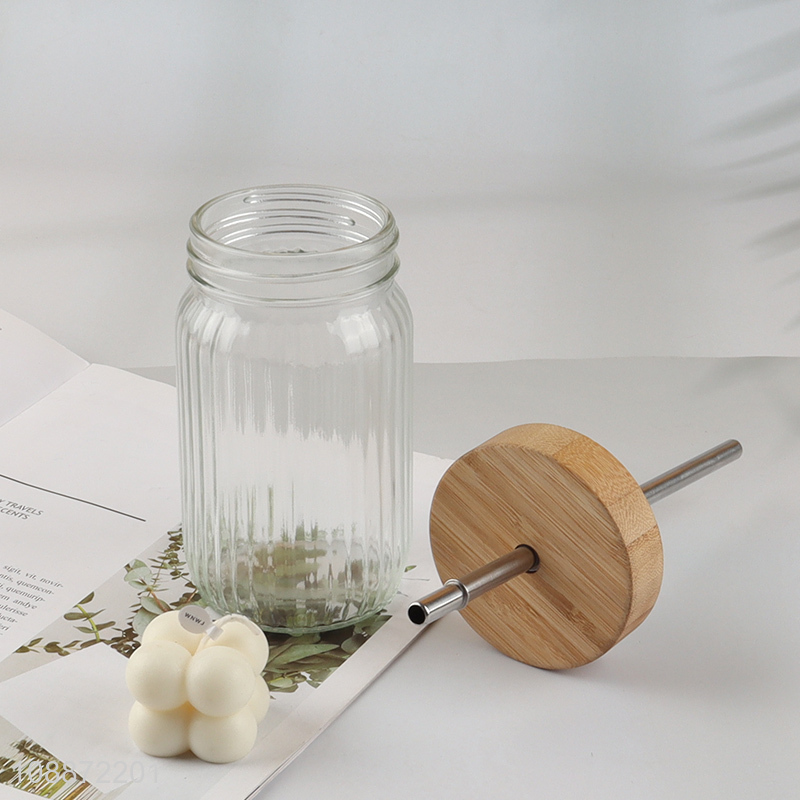 Wholesale clear glass mason jar cup with bamboo lid & stainless steel straw