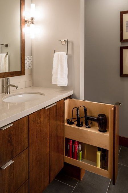 If you're renovating your bathroom, leave room for a super narrow alcove. Install shelves, then use them to stack extra towels and hold baskets with beauty supplies.